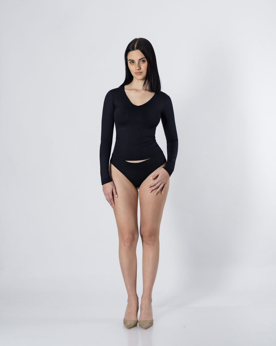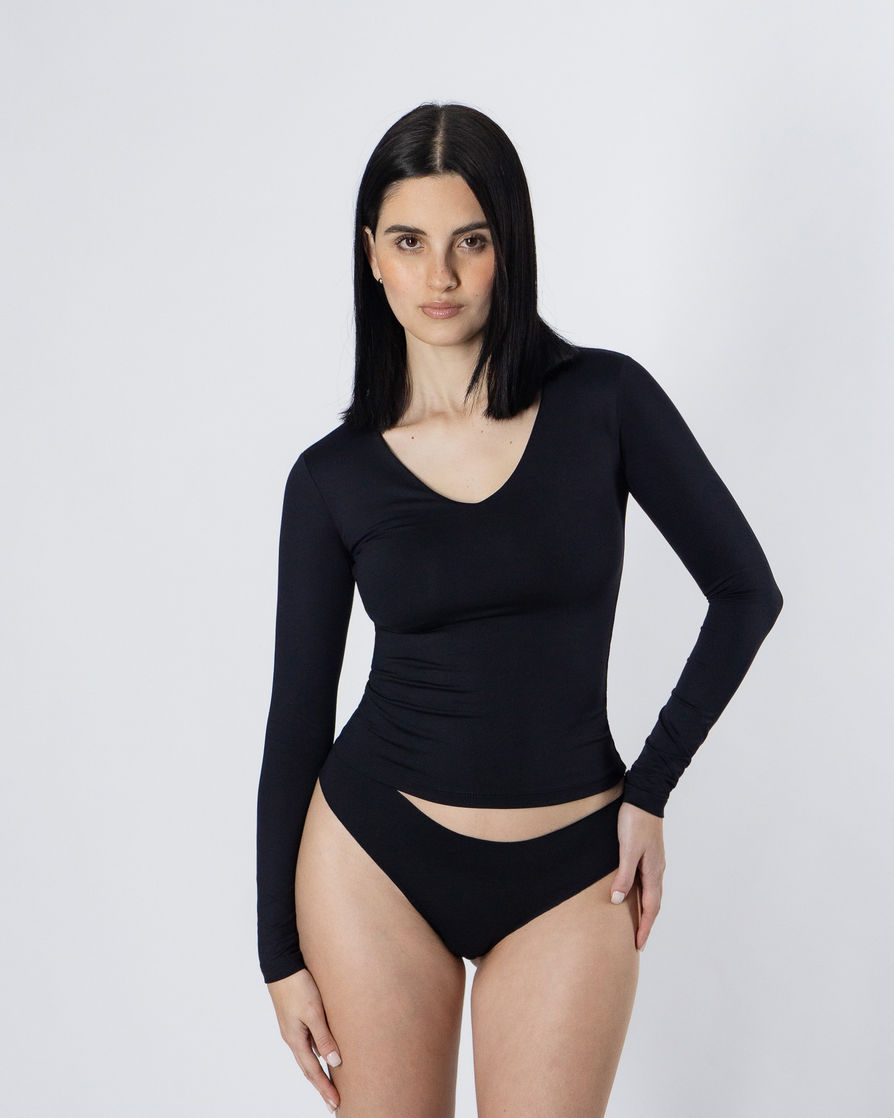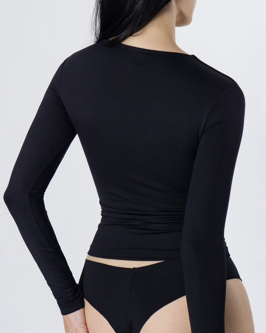 V-neck long-sleeve tee with full front inner lining. Perfect silhouette and a stretchy fit. A high-quality piece crafted from premium Brazilian lycra. Features: