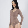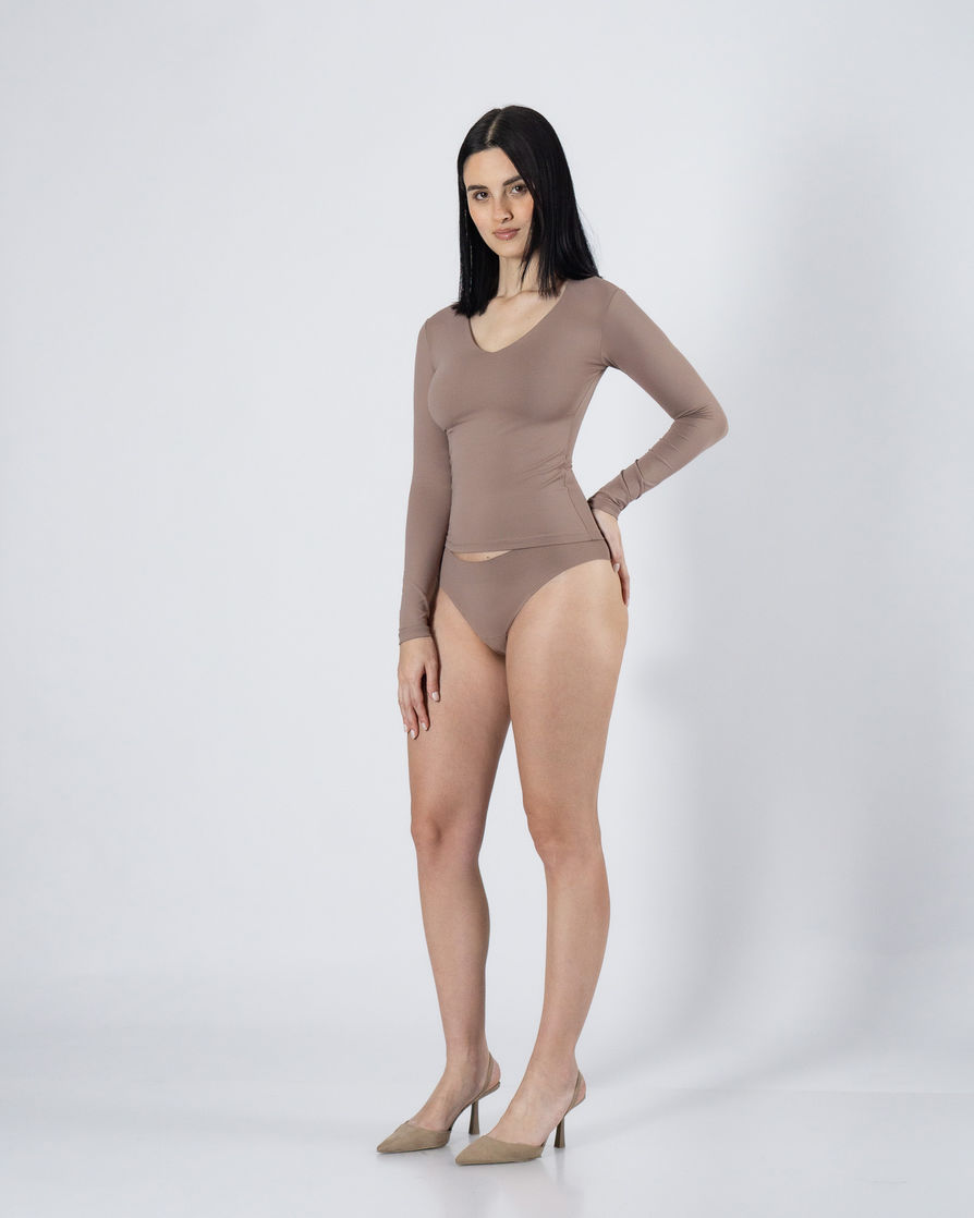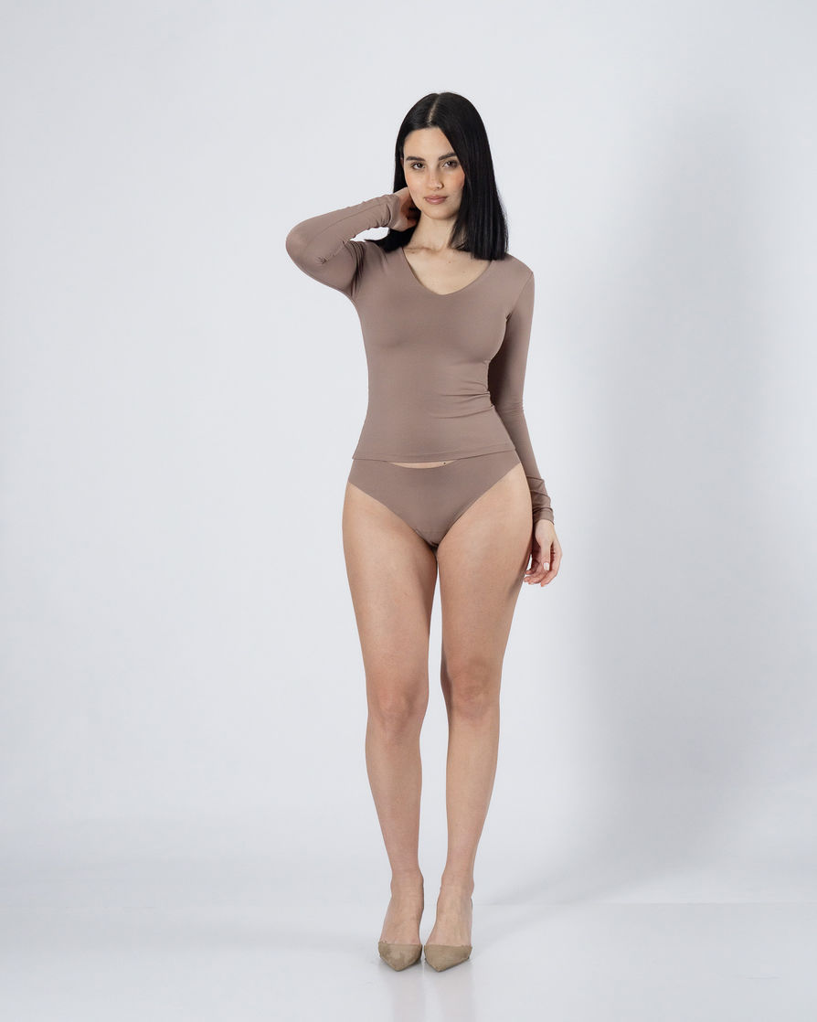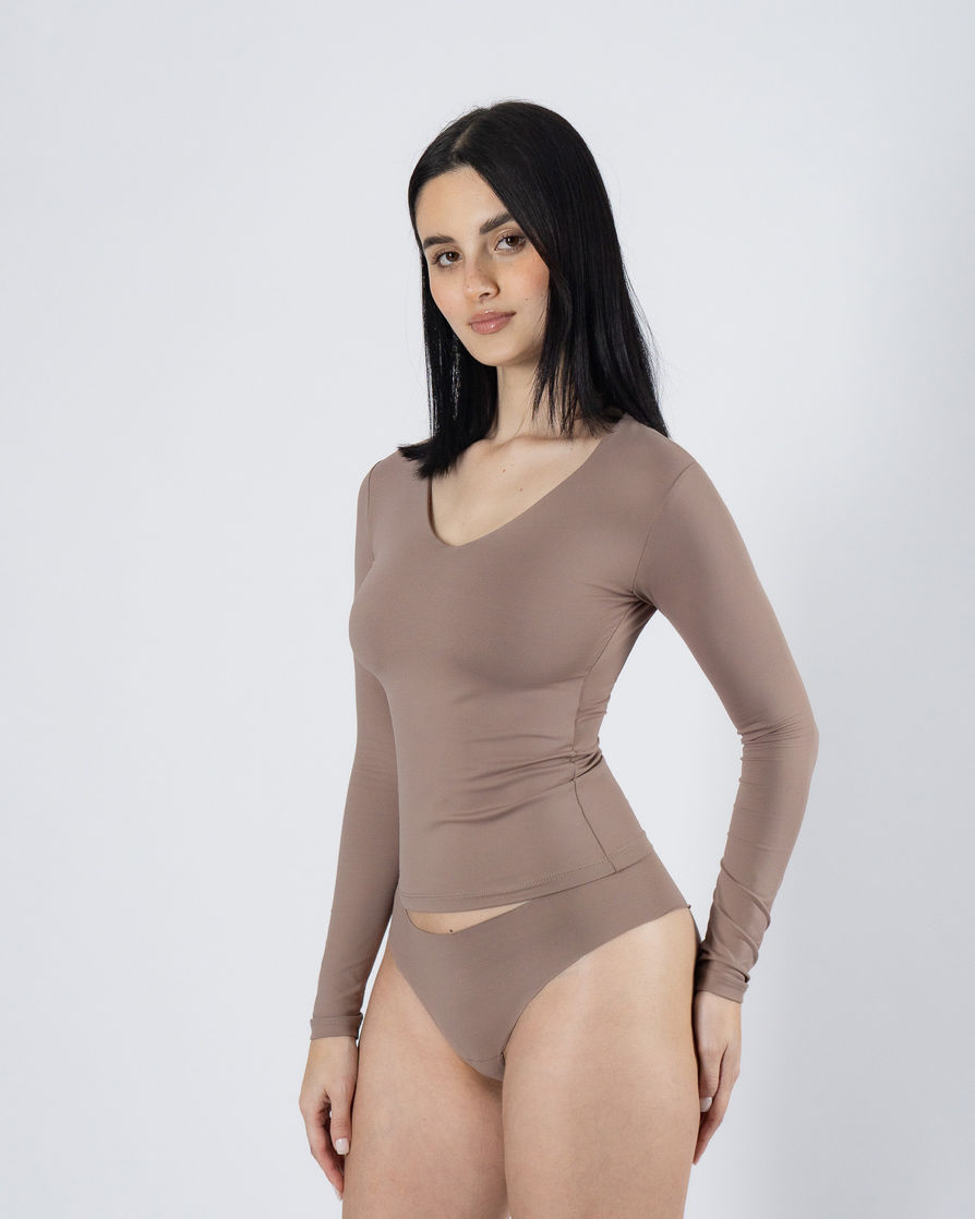 V-neck long-sleeve tee with full front inner lining. Perfect silhouette and a stretchy fit. A high-quality piece crafted from premium Brazilian lycra. Features: